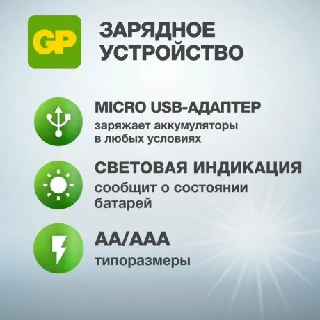 Прибор оснащен разъёмом MicroUSB, что позволяет заряжать само устройство от сети, через компьютер, в машине и т.п., оснащено удобной световой индикацией, зелёный светодиод загорается на 0.5 с после подачи питания через USB. В процессе заряда светодиод мигает. Ориентировочное время зарядки для типоразмера АА – 8 часов, для ААА – 3часа. Корпус устройства выполнен из лёгкого и прочного пластика. Автоматическая функция отключения при полном заряде защитит устройство от перегрева. Быстрое мигание индикатора предупредит, что в слотах находятся неисправные аккумуляторы или вставленные по ошибке одноразовые батарейки.