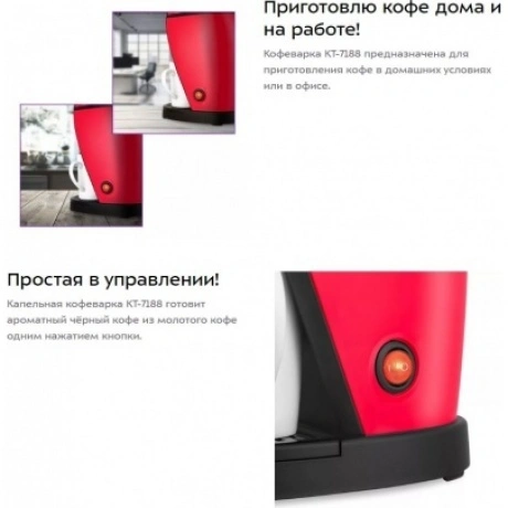 Кофеварка КТ-7188 предназначена для приготовления кофе в домашних условиях или в офисе. Капельная кофеварка КТ-7188 готовит ароматный чёрный кофе из молотого кофе одним нажатием кнопки. В капельной кофеварке горячая вода медленно поступает в фильтр с молотым кофе. Пройдя через него, она попадает в кружки. Две керамические кружки идут в комплекте. Многоразовым нейлоновым фильтром можно пользоваться неограниченное количество раз. Фильтр вмещает 15 грамм молотого кофе, а ёмкость резервуара для воды составляет 300 мл. Кофеварка предназначена для приготовления двух порций кофе одновременно. Кофеварка лёгкая и занимает мало места, что очень удобно в квартирах с маленькими кухнями.