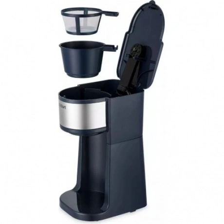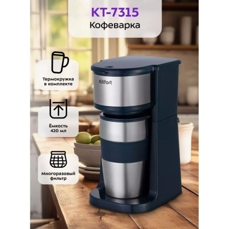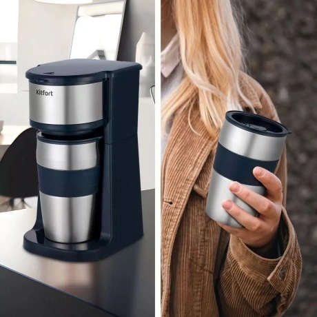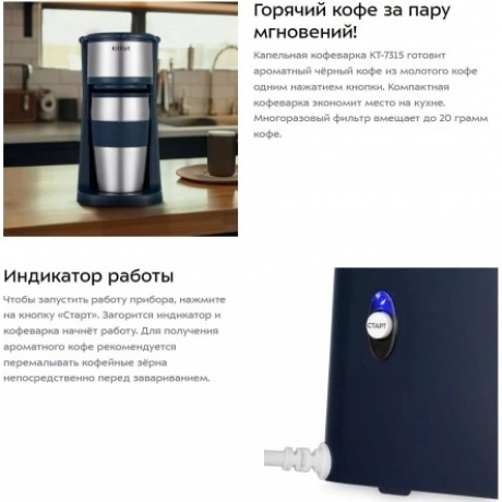 Капельная кофеварка КТ-7315 готовит ароматный чёрный кофе из молотого кофе одним нажатием кнопки. Компактная кофеварка экономит место на кухне. Многоразовый фильтр вмещает до 20 грамм кофе. Чтобы запустить работу прибора, нажмите на кнопку «Старт». Загорится индикатор и кофеварка начнёт работу. Для получения ароматного кофе рекомендуется перемалывать кофейные зёрна непосредственно перед завариванием. Термокружка выполнена из нержавеющей стали с силиконовой вставкой, которая не даст вам обжечься или выронить из рук термокружку. Крышка термокружки позволяет пить кофе на ходу, благодаря удобной форме отверстия для питья, которое можно закрывать. В кофеварке горячая вода медленно поступает в фильтр с молотым кофе. Многоразовым фильтром можно пользоваться любое количество раз. Сетка фильтра изготовлена из нейлона. Фильтр вмещает 20 грамм молотого кофе, а резервуар для воды имеет ёмкость 420 мл. Кофеварка КТ-7315 обладает не только большим функционалом, но и компактным размером и украсит любую кухню! Угостить гостей чашкой горячего кофе или взять любимый напиток с собой по пути на работуx Выбирать вам!