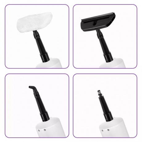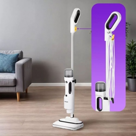 Паровая швабра 2 в 1 КТ-1062 универсальное устройство, которое поможет избавиться от пыли и грязи с помощью мощной струи пара и продезинфицирует поверхность. Паровая швабра очистит раковину и плиту на кухне, зеркала и мебель исключительно паром. Конструкция 2 в 1 предусматривает наличие ручного модуля, который используется с насадками: плоская и круглые нейлоновые щётки, насадка для отпаривания с резиновым скребком, тряпка для отпаривания. С их помощью можно очистить любые вещи в доме. Устройство обладает большим углом наклона при уборке, который поможет легко убирать пространство под мебелью. Струйная и угловая насадки помогут очистить щели и углы. Устройство оснащено съёмным резервуаром для воды ёмкостью 400 мл, что позволяет производить непрерывную уборку от 26 до 40 минут в зависимости от интенсивности подачи пара. Во время работы паровой швабры вода из резервуара подается в бойлер помпой. Принцип действия паровой швабры основан на воздействии горячего пара на загрязнения. Пар проникает внутрь загрязнения, размягчая и растворяя его, а затем с помощью тряпки частички грязи смываются. Всего устройство имеет две интенсивности подачи пара. Уборка с паровой шваброй КТ-1062 будет проходить быстро и легко. Для неё не нужны чистящие средства, поэтому она станет идеальным решением уборки для аллергиков. В комплекте есть рамка для ковра, которая обеспечивает легкое скольжение щётки по ковру. Паровая швабра обладает функцией вертикальной парковки. На удлинительной трубке предусмотрены держатели для шнура. Множество насадок, которые идут в комплекте с паровой шваброй, справятся с труднодоступными местами и сложными поверхностями.