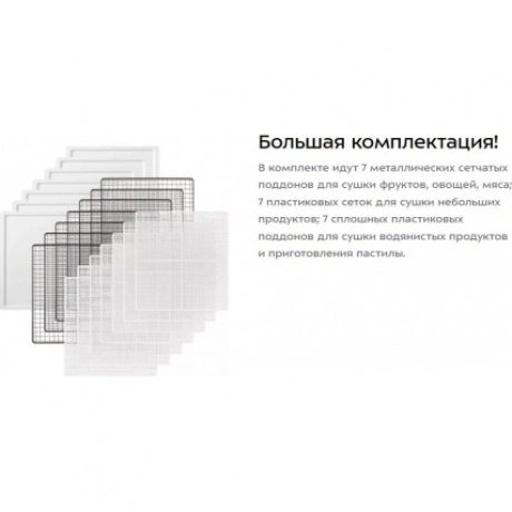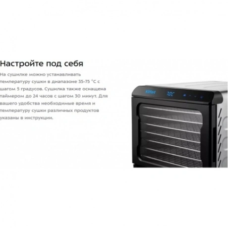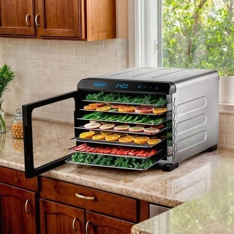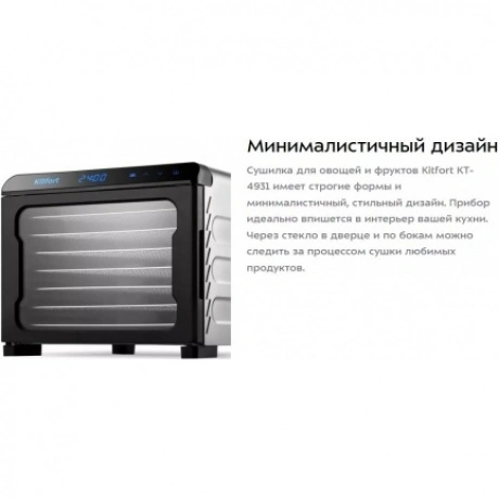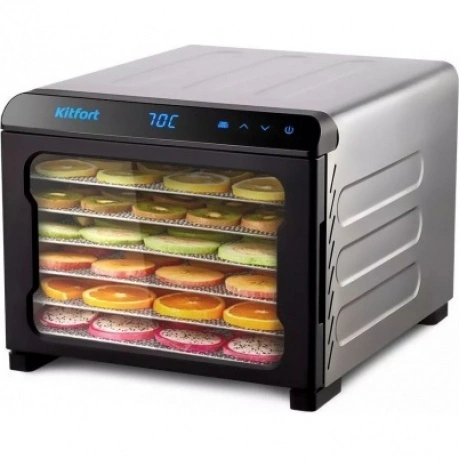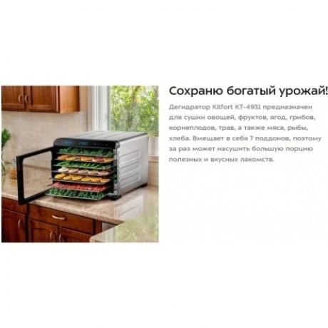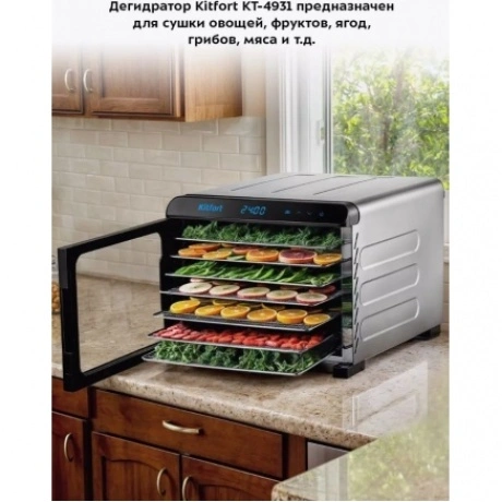 Вместительная сушилка Kitfort КТ-4931сохранит любимые фрукты и овощи полезными круглый год! Она насушит на всю зиму мясо, рыбу, помидоры, клубнику, персики, грибы, зелень, хлеб, а с помощью сплошных поддонов можно приготовить и пастилу.