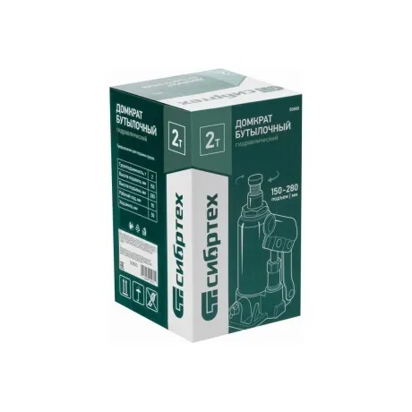 Домкрат гидравлический бутылочный Сибртех 50800 предназначен для подъема грузов массой до 2 т на высоту от 150 до 280 мм. Не требует больших усилий от пользователя и значительно облегчает рабочий процесс. Домкрат будет полезен при проведении техобслуживания машины в автосервисе или гараже.