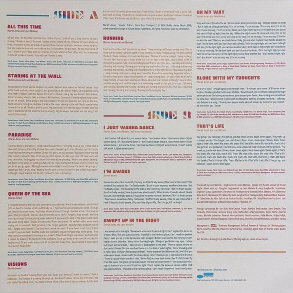 All This Time (Norah Jones/Leon Michels), Staring At The Wall (Norah Jones/Leon Michels), Paradise (Norah Jones/Leon Michels), Queen Of The Sea (Norah Jones), Visions (Norah Jones), Running (Norah Jones/Leon Michels), I Just Wanna Dance (Norah Jones/Leon Michels/Homer Steinweiss), I’m Awake (Norah Jones), Swept Up In The Night (Norah Jones/Leon Michels), On My Way (Norah Jones/Pete Remm), Alone With My Thoughts (Norah Jones/Leon Michels), That’s Life (Norah Jones/Leon Michels)