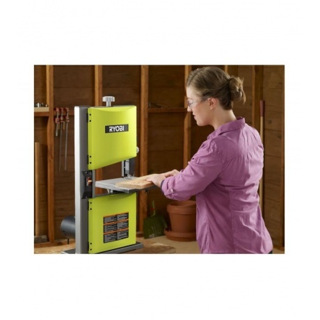 Ленточная пила Ryobi RBS904 с мощностью электропривода 350 Вт размещается на рабочем столе и позволяет выполнять пиление заготовок из древесины и древесных материалов. Заготовки располагаются на металлическом столе размером 305 x 305 мм. Пила дает возможность производить прямое пиление дерева, нарезать плоскую спираль, резать древесину по окружности. Максимальная глубина пропила при ведении реза под углом 90° в этой модели составляет 80 мм. Ленточная пила Ryobi RBS904 оборудована подсветкой рабочей зоны, которая значительно упрощает работу при недостаточном внешнем освещении. В качестве рабочего органа в пиле применяется пильное ленточное полотно с полной длиной 1572 мм, которое в процессе работы движется со скоростью 660 м/мин. Станок питается от сети 220 В и поставляется в комплекте с документацией и гарантийным талоном.
