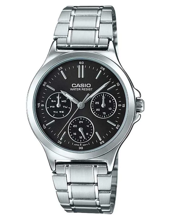 Женские наручные часы Casio с дополнительным отображением на малых циферблатах даты, дня недели и текущего времени в 24-х часовом формате. Элемент питания SR920SW, срок службы батарейки 3 года. Заводная головка с защитой. Браслет с раскладывающейся застежкой. Вес часов 62 грамма.