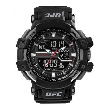 Спортивный силиконовый ремешок для часов и водонепроницаемость до 50 метров делают из этих часов модный аксессуар. Массивные мужские часы-хронограф UFC Tactic. Секундомер с максимальным временем измерения 24 часа и режимом LAP (промежуточный результат). Таймер обратного отсчета до 24ч. Мировое время. Второй часовой пояс в цифровом формате. Заводная головка с защитой. Силиконовый ремешок с классической застежкой.