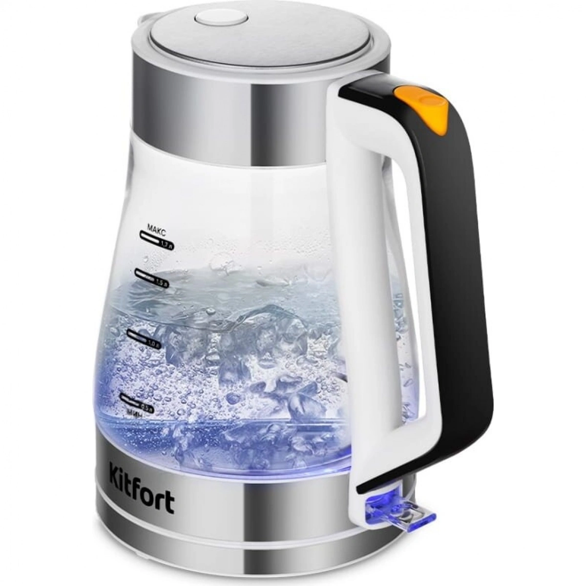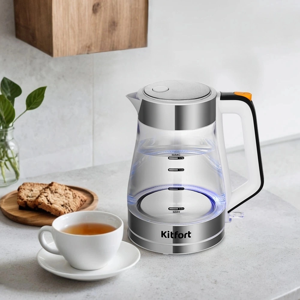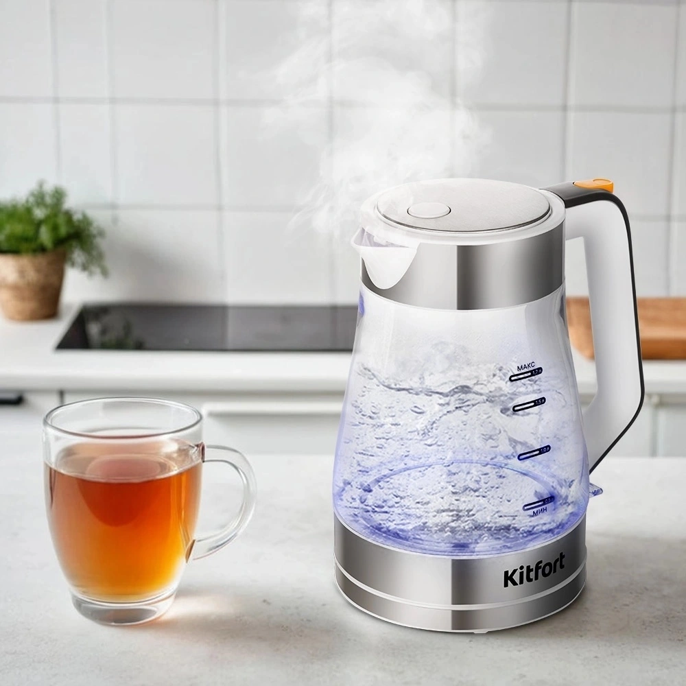 Электрический чайник Kitfort КТ-6626 предназначен для кипячения воды дома, в офисе, на даче. При включении чайника загорается подсветка, которая является индикатором работы. Корпус чайника выполнен из нержавеющей стали и стекла. Крышка и подставка выполнены из нержавеющей стали и пластмассы. Отметки «МАКС» и «МИН» нанесены на стеклянную часть чайника. Ручка чайника пластиковая, не нагревается и удобно лежит в руке.
