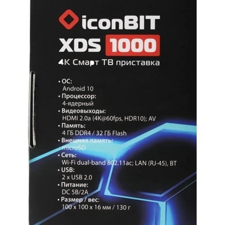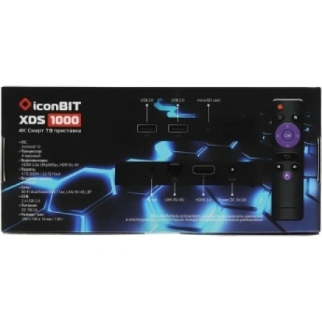 Медиаплеер iconBIT XDS1000 представляет собой универсальное решение для использования как дома, так и в офисе. Данная модель оснащена мощной начинкой, 4 ГБ оперативной и 32 ГБ постоянной памяти и может выводить изображение в разрешении вплоть до 4K. В основе используется ОС Android 10 с множеством различных приложений, предоставляющих доступ к фильмам, музыке, стримам, а также прямым трансляциям спортивных событий. Отличительной особенностью медиаплеера является возможность автовключения, автовоспроизведения, зацикливания и повтора записей. Помимо этого модель обладает простым и удобным интерфейсом, что вкупе с пультом ДУ делает использование особенно простым и удобным. Медиаплеер iconBIT XDS1000 выполнен в прочном и компактном корпусе. Для подключения к экрану может использоваться HDMI-выход, а также композитный выход AV. Также на корпусе есть несколько портов USB для подключения внешних носителей, порт Ethernet и слот для карт памяти. Подключение к сети Интернет также может осуществляться при помощи Wi-Fi. Для питания используется сеть 220 В.