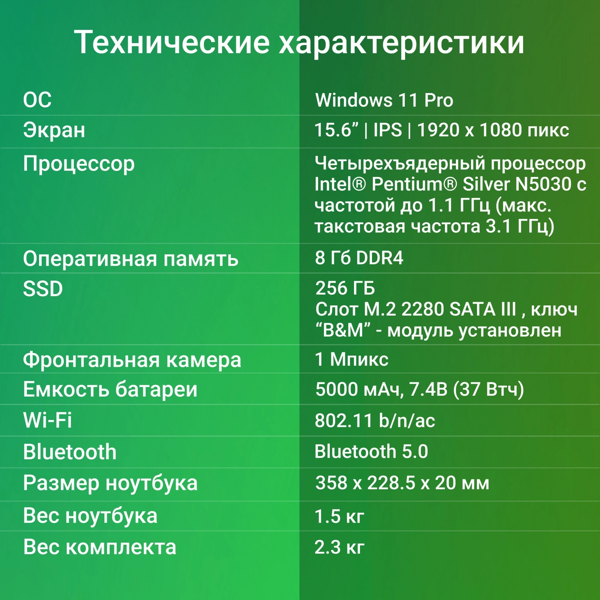 Сердцем ноутбука является процессор Intel Pentium, который обеспечивает превосходную производительность для повседневных задач. Объем оперативной памяти в 8 ГБ и SSD-накопитель на 256 ГБ гарантируют быструю загрузку системы и приложений, а также достаточное пространство для хранения необходимых файлов и документов.