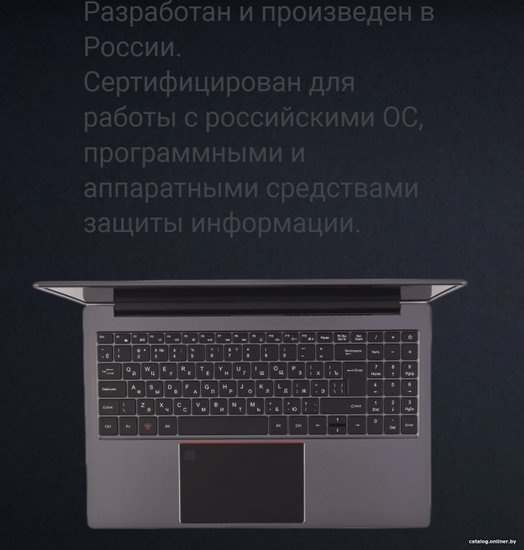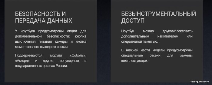 У ноутбука предусмотрены опции для дополнительной безопасности: кнопка выключения питания камеры и кнопка моментального выхода из сессии. Поддерживаются модули «Соболь», «Аккорд» и другие, популярные в государственных органах России.