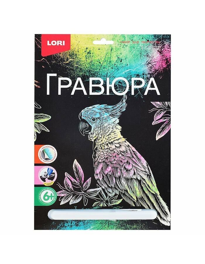 Набор для творчества Lori Гравюра большая Попугай ГР-630 способствует развитию творческого потенциала, воспитывает усидчивость и терпение. Гравюра представляет собой многослойное панно, покрытое чёрной краской, на которое нанесён контур рисунка. Техника создания гравюры увлекательна и достаточно проста. Необходимо лишь взять штихель – особый скребок, входящий в состав набора, и процарапать рисунок гравюры. Работа с гравюрой развивает усидчивость, внимательность и образное мышление.