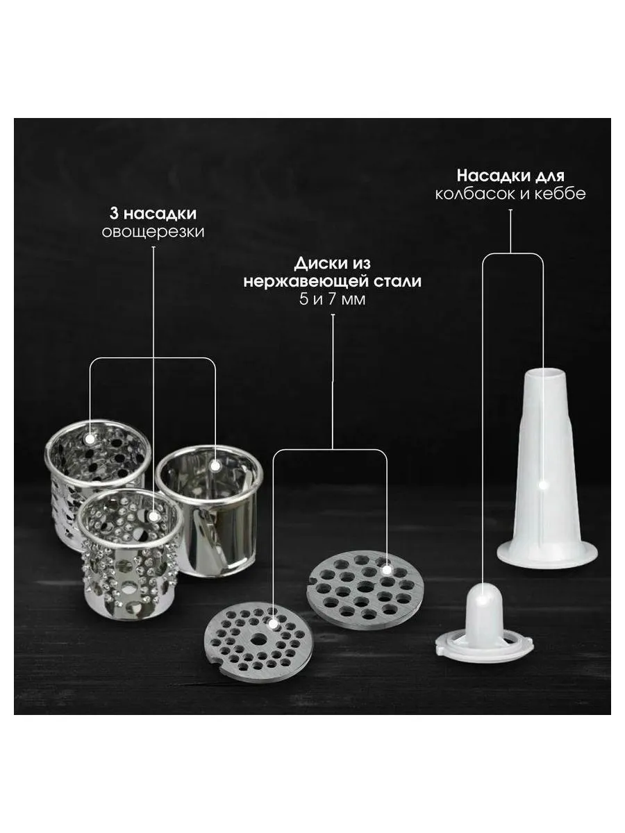 насадка-терка (3 шт.), насадка для кеббе, насадка для колбасы, нож, перфорированный диск (2 шт.)