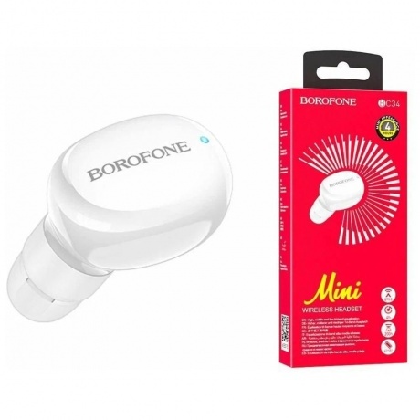 Bluetooth-моногарнитура Borofone BС34 выполнена в белом корпусе из пластика. Благодаря компактности и силиконовому вкладышу она комфортно располагается в слуховом канале. Динамик формирует четкий звук при проигрывании музыки. За точность передачи голоса отвечает интегрированный микрофон. Беспроводная синхронизация с устройствами выполняется на основе технологии Bluetooth. С помощью сенсорных кнопок можно управлять воспроизведением аудио и вызовами. Аккумулятор гарантирует до 4 часов автономной работы моногарнитуры Borofone BС34.