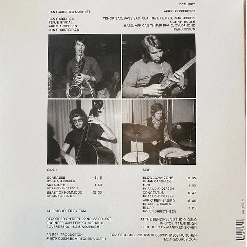 Afric Pepperbird — альбом квартета Яна Гарбарека, первоначально выпущенный в 1971 году. Luminessence - новая серия переизданий от ECM, представляющая жемчужины обширного каталога лейбла в элегантных, высококачественных изданиях. Издание на виниле 180 г. Записанный в Осло в сентябре 1970 года, Afric Pepperbird был выпущен на Новый год в 1971 году. Более полувека спустя он по-прежнему передает свежесть и азарт совершаемых открытий. Альбом ознаменовал приход четырёх норвежских импровизаторов - Яна Гарбарека, Терье Рипдаля, Арильда Андерсена и Йона Кристенсена - на начинающий лейбл ECM. Это стало началом пожизненного объединения с каждым из музыкантов, влияние которых вскоре должно было выйти далеко за пределы их родины.