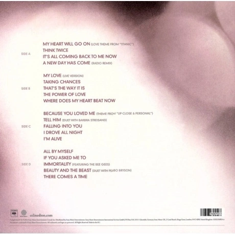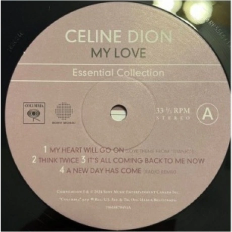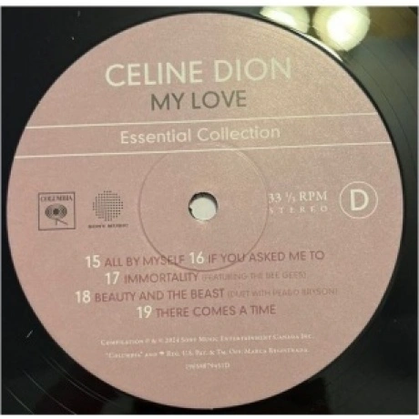 «My Love: Essential Collection» Селин Дион отдает дань уважения классическим песням, которые положили начало ее карьере и взволновали миллионы. Издание на виниле.. В альбом вошли некоторые из самых больших хитов Селин, в том числе «My Heart Will Go On», удостоенная наград «Оскар» и «Грэмми», занявшая первое место в международных чартах «All By Myself» (ее незабываемое исполнение основополагающей баллады Эрика Кармена), «Where Does My Heart Beat Now» (первый англоязычный сингл Селин) и заглавный трек «My Love», написанный Линдой Перри.