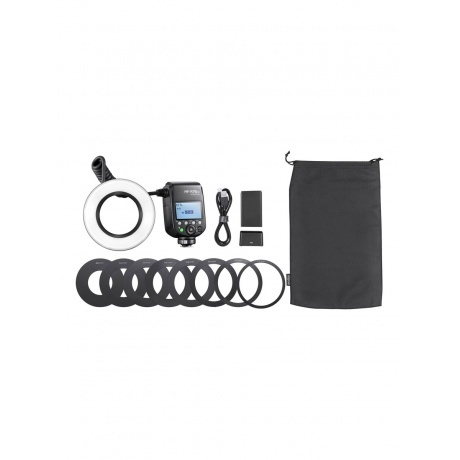 вспышка для макросъемки Godox MF-R76N TTL для Nikon, литиевый аккумулятор Godox VB26A, зарядное устройство USB, кабель для зарядки, чехол для вспышки, комплект переходных колец AR-R, руководство по эксплуатации и гарантийный талон, упаковка