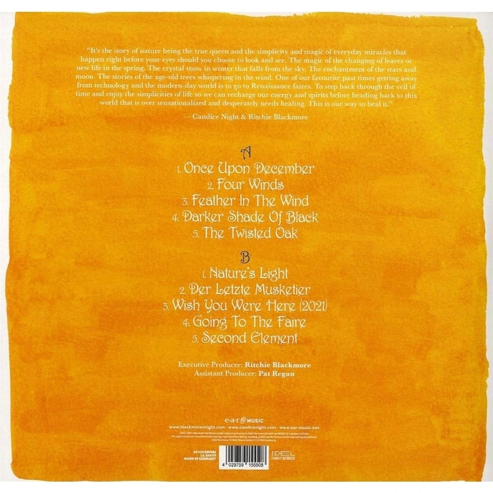 "Nature's Light" - студийный альбом 2021 года коллектива Blackmore's Night. Первый студийный альбом после перерыва длиною в 6 лет.Релиз представлен на черном виниле.Blackmores Night - фолк-рок-группа, основанная в 1997 году бывшим гитаристом Deep Purple и Rainbow Ричи Блэкмором (акустические и электрические гитары, мандола, лютня и другие инструменты) и Кэндис Найт (вокал, духовые, перкуссия). Название группы может толковаться и как каламбур: "Найт Блэкмора".Музыкальной основой и главным вдохновением музыкантов является музыка эпохи Возрождения. Группа также часто исполняет кавер-версии песен различных исполнителей XX века, а также песни, написанные Блэкмором в составе Rainbow.
