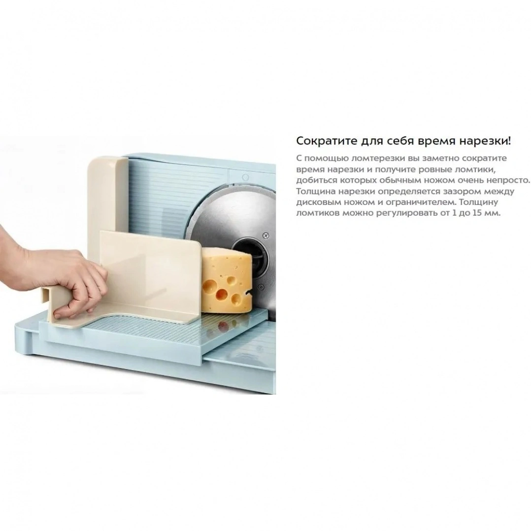 С помощью ломтерезки вы заметно сократите время нарезки и получите ровные ломтики, добиться которых обычным ножом очень непросто. Толщина нарезки определяется зазором между дисковым ножом и ограничителем. Толщину ломтиков можно регулировать от 1 до 15 мм.