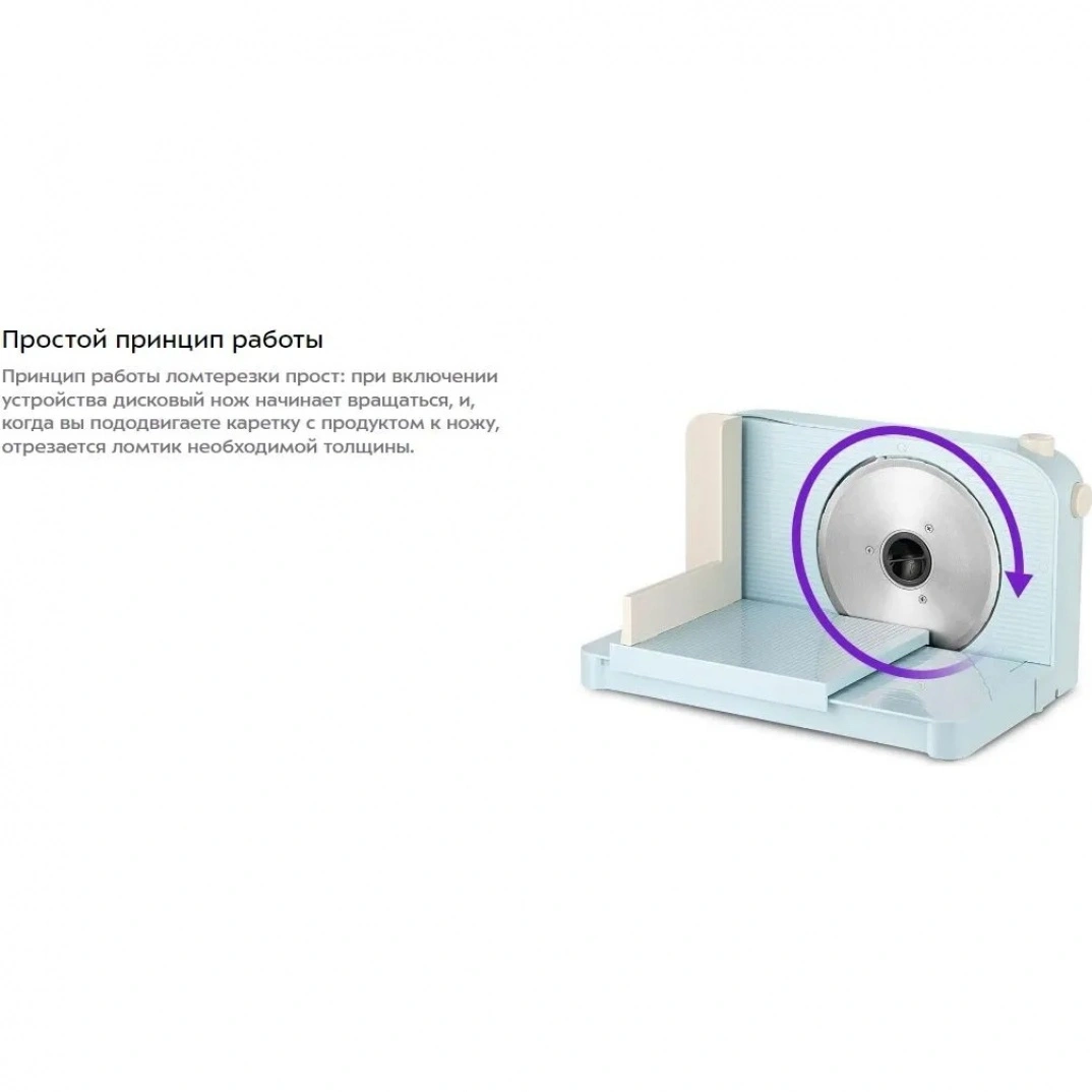 Принцип работы ломтерезки прост: при включении устройства дисковый нож начинает вращаться, и, когда вы пододвигаете каретку с продуктом к ножу, отрезается ломтик необходимой толщины.