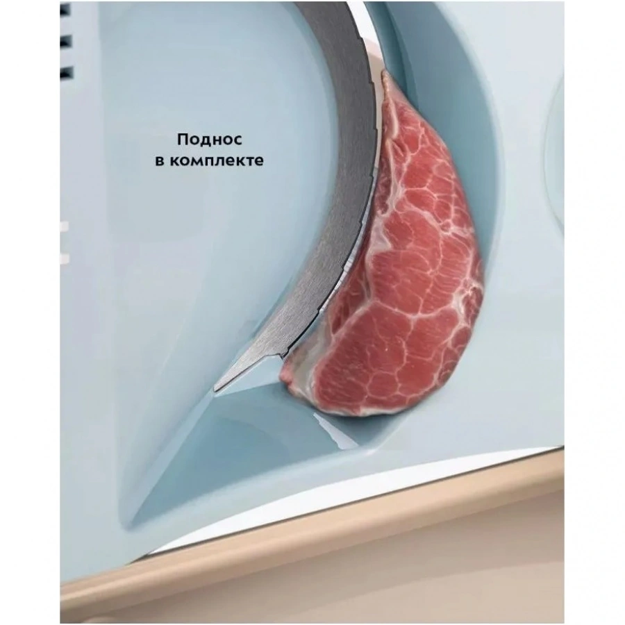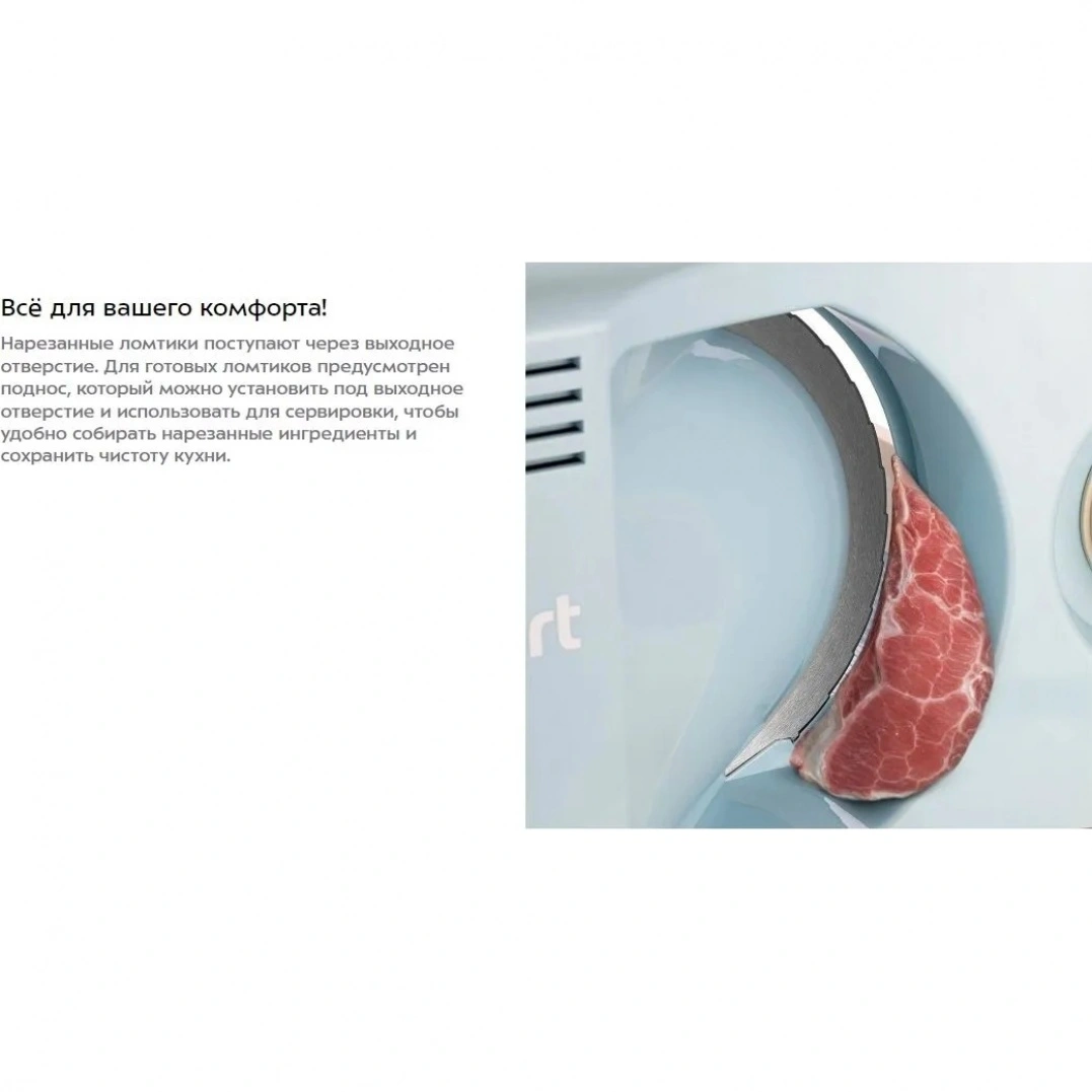 Нарезанные ломтики поступают через выходное отверстие. Для готовых ломтиков предусмотрен поднос, который можно установить под выходное отверстие и использовать для сервировки, чтобы удобно собирать нарезанные ингредиенты и сохранить чистоту кухни.