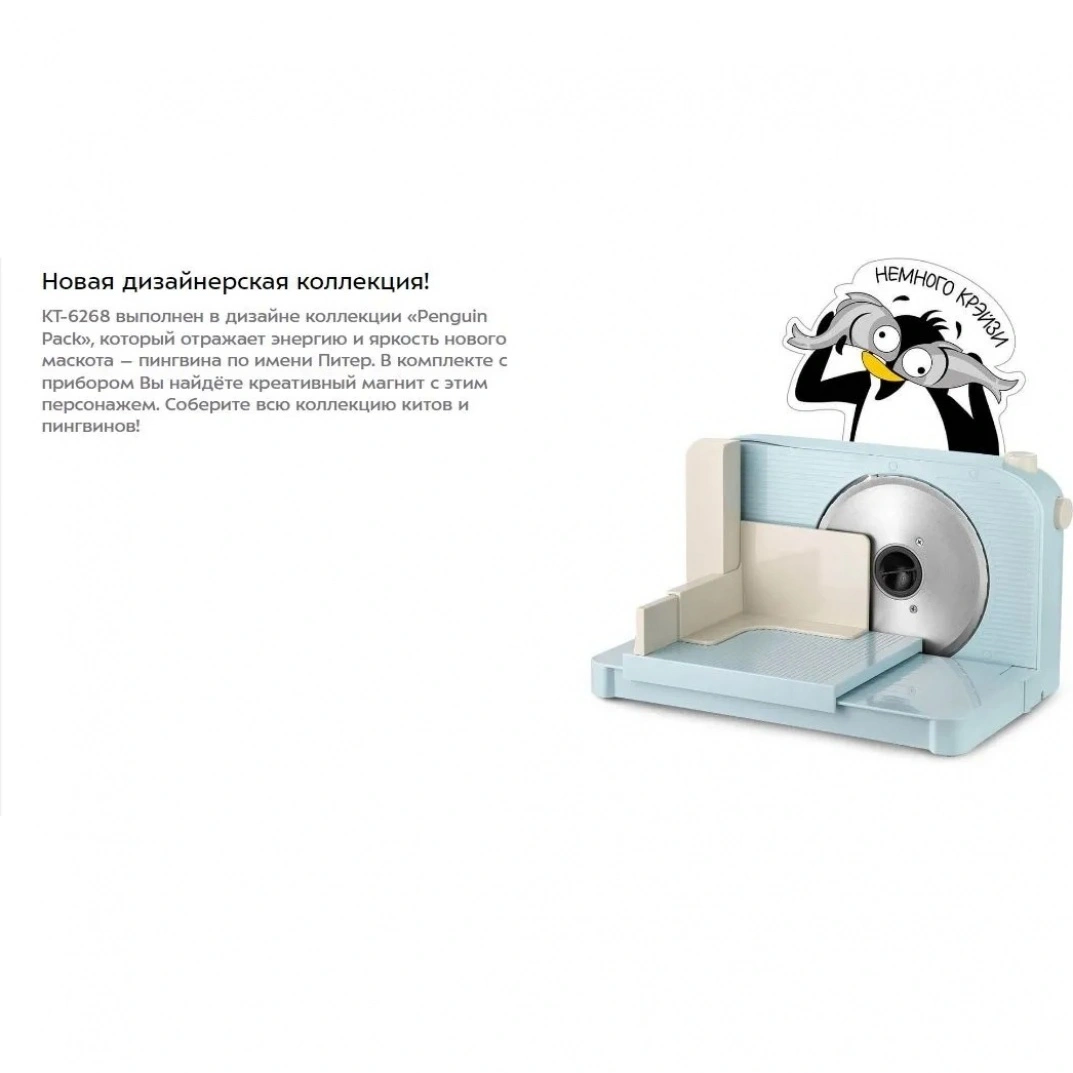 КТ-6268 выполнен в дизайне коллекции «Penguin Pack», который отражает энергию и яркость нового маскота – пингвина по имени Питер. В комплекте с прибором Вы найдёте креативный магнит с этим персонажем. Соберите всю коллекцию китов и пингвинов!
