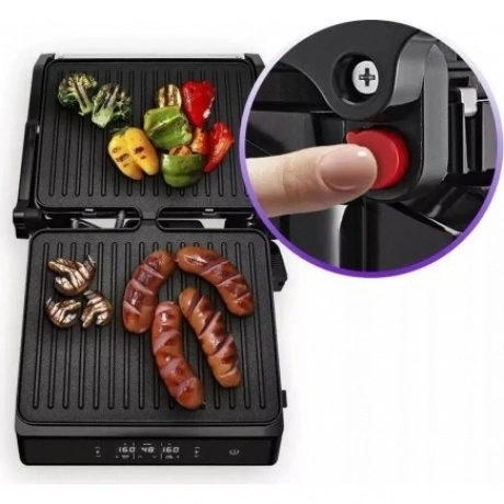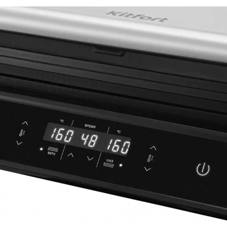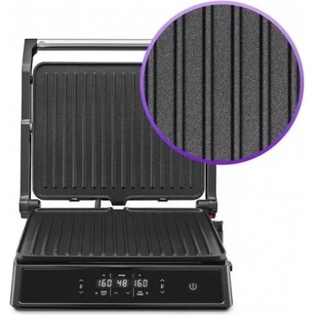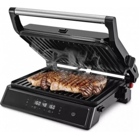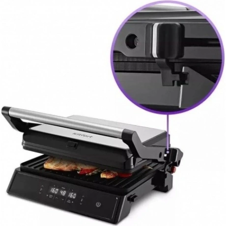 Электрогриль КТ-3682 предназначен для приготовления мяса, рыбы, овощей, сосисок, бутербродов, панини, сэндвичей, гренок, тостов и многих других блюд. Ребристая поверхность и высокая температура позволяют удалить излишки жира из продуктов. Устройство оснащено дисплеем со всей нужной информацией. Кнопки позволяют включать/выключать нагрев, регулировать температуру от 60 до 230°C и устанавливать таймер от 1 до 99 минут. Панели нагреваются до нужной температуры, после чего индикатор гаснет. Кнопка «180°» позволяет разложить гриль и использовать его в одностороннем режиме. Чтобы разложить гриль, нажмите на кнопку и, удерживая её, откройте крышку гриля на 180°. На панели нанесено антипригарное покрытие, что позволяет готовить с минимальным количеством масла. Такое покрытие также облегчает процесс чистки панелей. Панели этого гриля съемные. Специальный фиксатор сбоку гриля удерживает крышку в закрытом состоянии, а также позволяет удерживать крышку в приоткрытом положении. Такой режим приготовления полезен при готовке продуктов, которые могут потерять форму из-за давления верхней крышки. Весь лишний жир и сок из блюд попадет в съемный поддон. Просто выньте поддон и помойте его с моющим средством! Также у прибора установлены прорезиненные ножки, которые не дают прибору скользить по столу во время готовки. Электрогриль КТ-3682 позволяет приготовить аппетитные и сочные блюда с минимальными затратами времени и усилий. Он станет отличным помощником в приготовлении завтрака, обеда или ужина для всей семьи.