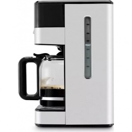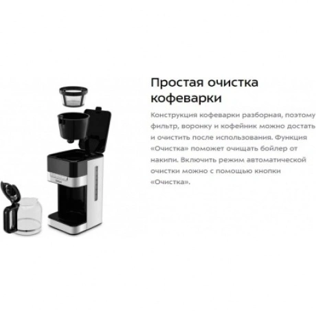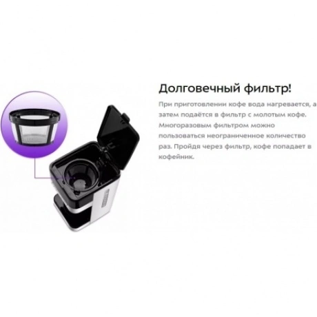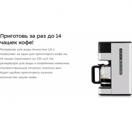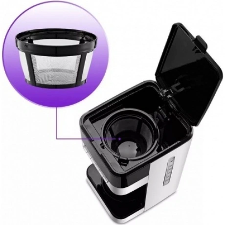 Капельная кофеварка КТ-7203 готовит ароматный чёрный кофе из молотого кофе. Вы можете выбирать крепость кофе при приготовлении. Кофеварка идеально подойдёт для приготовления кофе в домашних условиях или в офисе. Управление кофеваркой осуществляется при помощи кнопок на панели управления. На дисплее отображаются выбранный режим, а также текущее время или время подогрева. Функция отложенного старта позволит начать приготовление кофе в заданное время. При приготовлении кофе вода нагревается, а затем подаётся в фильтр с молотым кофе. Многоразовым фильтром можно пользоваться неограниченное количество раз. Пройдя через фильтр, кофе попадает в кофейник. В месте установки кофейника находится платформа для подогрева. По завершении приготовления кофе включается подогрев. Общее время приготовления и подогрева составляет 40 минут, затем прибор автоматически выключится. Воронка кофеварки оборудована противокапельной системой – затвором, приостанавливающим подачу кофе при вынимании кофейника из кофеварки. Вы можете налить кофе в чашку, не дожидаясь окончания приготовления. Резервуар для воды ёмкостью 1.8 л позволяет за один раз приготовить кофе на 14 чашек (примерно по 130 мл). На резервуаре для воды и кофейнике нанесены соответствующие отметки, поэтому вам будет удобно приготовить нужное количество чашек кофе. Конструкция кофеварки разборная, поэтому фильтр, воронку и кофейник можно достать и очистить после использования. Функция «Очистка» поможет очищать бойлер от накипи. Включить режим автоматической очистки можно с помощью кнопки «Очистка».