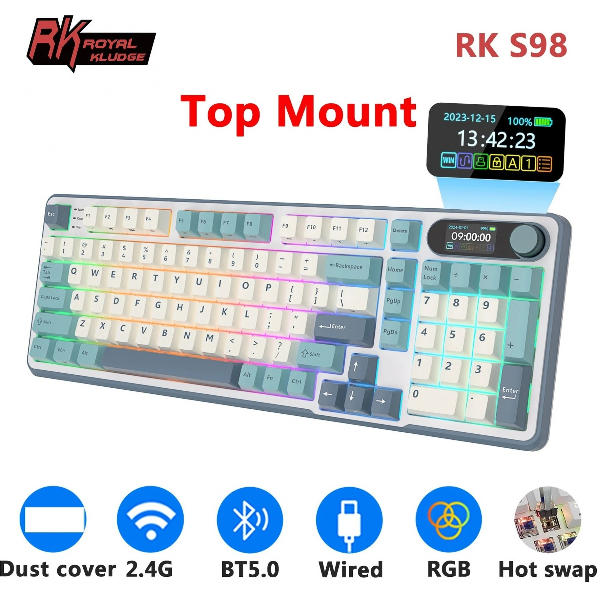 Полноразмерная (96%) механическая клавиатура Royal Kludge RK-S98 - 3 типа подключения (Bluetooth, радиоканал 2,4 ГГц, провод), 98 клавиш, LCD экран, цвет Light Cloud, переключатели RK Brown, Top Mount, профиль PBT Cherry, EN / RU - двойное литье (Double Shot), горячая замена переключателей 3/5 pin, настраиваемая RGB подсветка, USB хаб, порты USB-C (2), слой звукопоглощающего силикона, аккумулятор 3750 mAh, многофункциональный вращающийся переключатель режимов и громкости, размеры 410.3 x 40.6 x 42.8 мм, вес 1250 г.