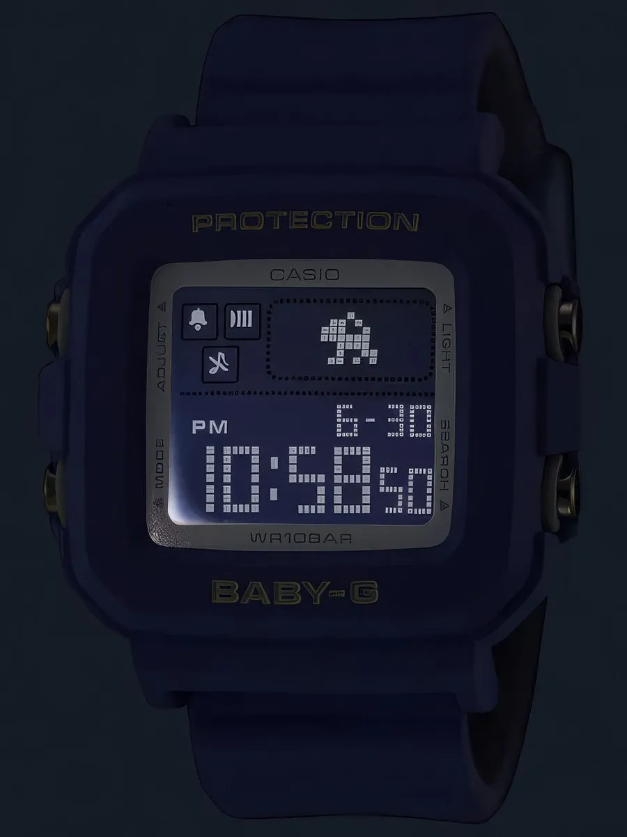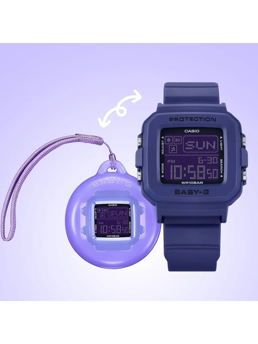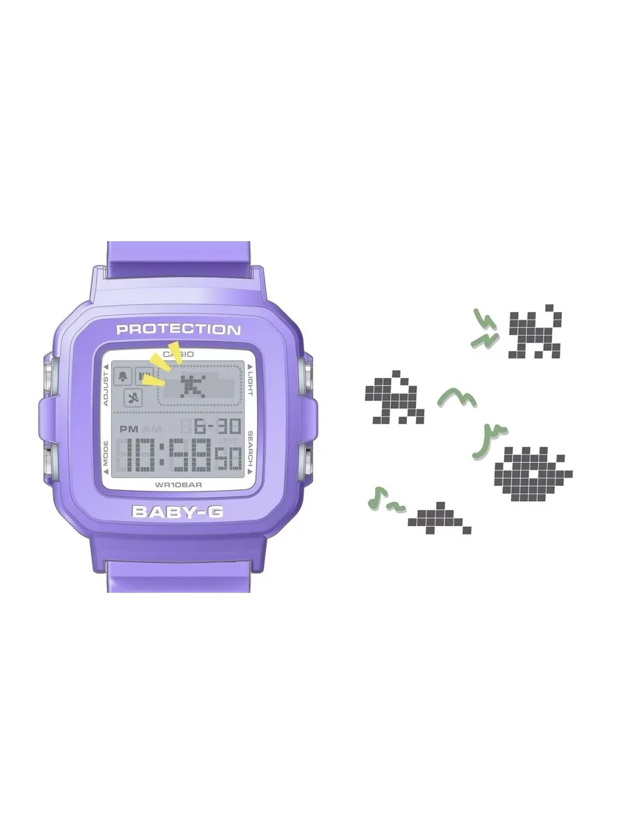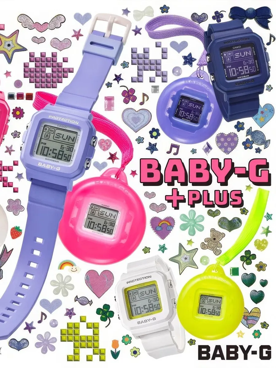 Яркая новинка Casio Baby-G 2024 года из семейства моделей BGD-10K в стильном и компактном синем полимерном корпусе. В 2024 году линейке женских часов Baby-G исполняется 30 лет и этому событию Casio посвятили данный релиз с отсылкой в дизайне модели и цветах к стилю конца 90-х и началу 2000-х годов. Благодаря дополнительному силиконовому холдеру в комплекте, часы могут превращаться в аксессуар для одежды или сумочки и своим внешним видом напоминать культовую японскую игрушку конца прошлого века — тамагочи. Усиливают отсылку к тамагочи и встроенные в часы персонажи (серфер, танцор, дельфин, рыбка, собака и кошка), которые проявляют себя в анимации при использовании подсветки часов. 12-ти и 24-х часовой формат времени. Автоматический календарь до 2099 года. 5 будильников, ежечасный сигнал. Секундомер с точностью 1/100 сек и временим измерения 24 часа. Таймер обратного отсчета до 24 часов. Питание от батарейки CR1616 рассчитанной на 3 года работы без замены. Ремешок с классической застежкой, обхват запястья от 120 до 180 мм. Вес часов 33 грамма.
