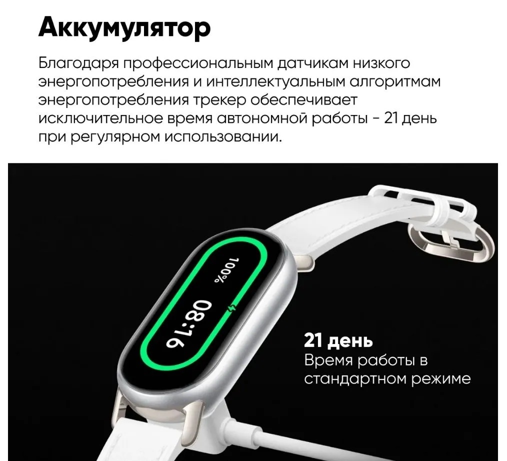 Пользуюсь с сентября 2024. Аккумулятор держится около недели, заряжается быстро ( примерно час мб полтора). Жаль только пришлось устанавливать для них другое приложение. Теперь весы и браслет у меня в разных приложениях( Со старой моделью в этом плане было удобнее. В остальном весь функционал улучшен и даже сенсорная панель стала меньше реагировать на капли. В старых моделях экраном управляли капли - один душ, и в твоей квартире играет музыка из плеера, а сам ты уже час занимаешься греблей)) В этой модели нюансы у сенсора есть, но не в таких масштабах) В целом браслет работает без нареканий - к покупке рекомендую)