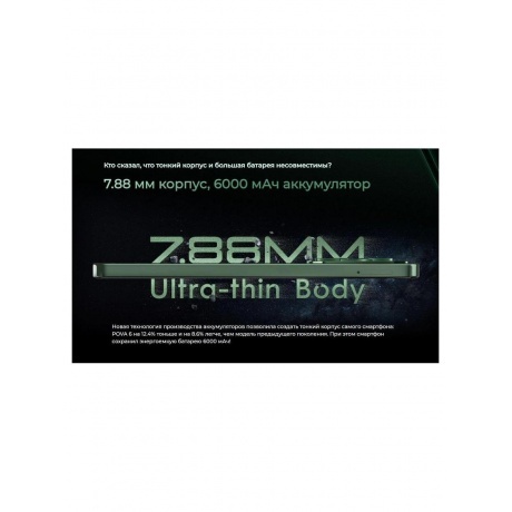 Футуристичный дизайн POVA 6 был вдохновлен высокими технологиями, искусственным интеллектом и эстетикой научной фантастики. Добро пожаловать в мир, где искусство и техника слились воедино!. Кто сказал, что тонкий корпус и большая батарея несовместимыx. Новая технология производства аккумуляторов позволила создать тонкий корпус самого смартфона: POVA 6 на 12.4% тоньше и на 8.6% легче, чем модель предыдущего поколения. При этом смартфон сохранил энергоемкую батарею 6000.