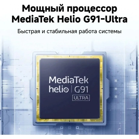Процессор MediaTek Helio G91 обеспечивает высокую производительность. Он оснащен 8 ядерным процессором с частотой 2,2 ГГц. Графический процессор Mali-G52 MP2 позволяет запускать графически интенсивные приложения и игры без задержек.