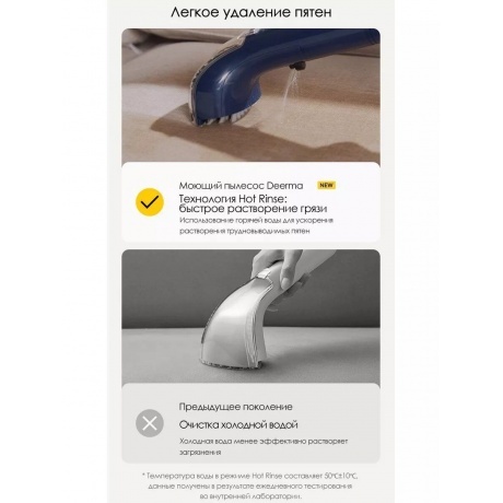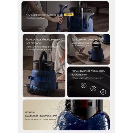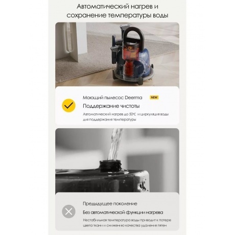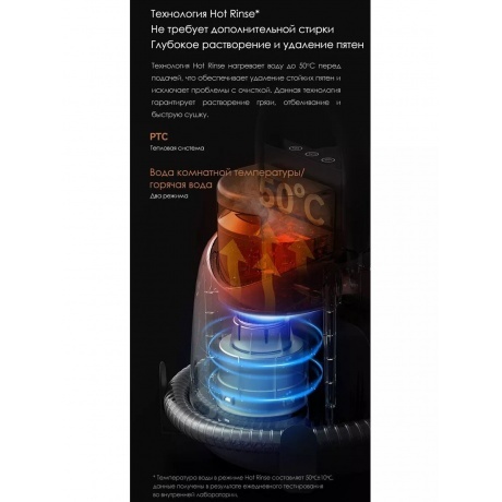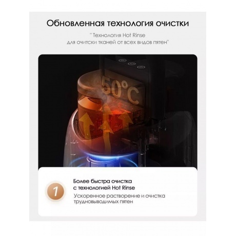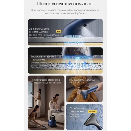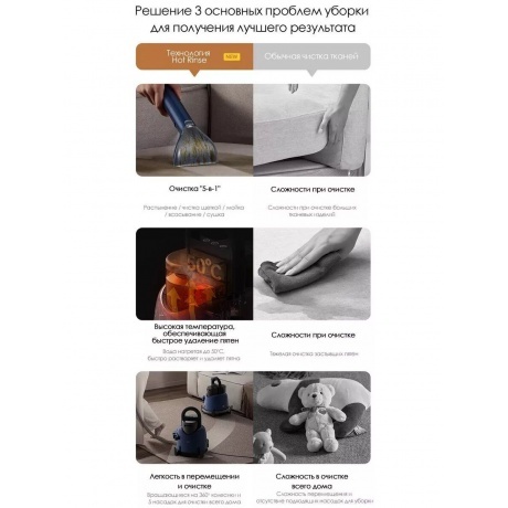 Моющий пылесос одновременно выполняет 5 функций. Распыление воды под давлением, глубокая чистка щеткой, очистка, всасывание и сушка. Вода может подаваться в двух режимах: режиме горячей воды и обычном (воды комнатной температуры). В режиме подачи горячей воды моющий пылесос нагревает воду перед подачей, что обеспечивает удаление стойких пятен и исключает проблемы с очисткой. В обычном режиме моющий пылесос обеспечивает защиту цветов, бережное очищение, подходит для кашемира и флиса. В режиме подачи горячей воды моющий пылесос очищает стойкие пятка, устраняя вредные микроорганизмы, подходит для глубокой очистки хлопка, льна, ковров. Моющий пылесос оснащен 5 обновленными функциональными насадками, которые обеспечивают набор средств для уборки всего дома.
