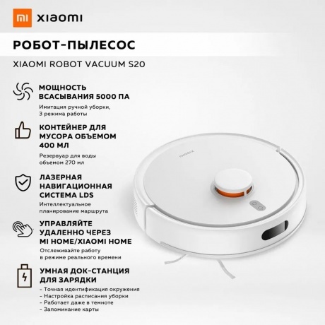 Оснащенный мощным всасывающим вентилятором 5000 Па и 3 режимами мощности, он легко удаляет пыль и волосы с пола и из труднодоступных щелей, обеспечивая глубокую очистку пола. Мусорный контейнер большой вместимости 2-в-1 с резервуаром для воды. Попрощайтесь с частым опорожнением мусорного контейнера и наполнением резервуара для воды. Мусорное ведро объемом 400 мл: опорожняется только по выходным. Резервуар для воды объемом 270 мл: нет необходимости в частой дозаправке. Зигзагообразный маршрут пылесоса и Y-образный маршрут мытья полов. Зигзагообразный маршрут обеспечивает максимальную эффективность очистки, а Y-образный маршрут специально разработан для мытья полов и имитирует ручную уборку путем протирания одной и той же поверхности в двух направлениях, что позволяет легко удалять пятна. Диапазон обнаружения 360 градусов. Xiaomi Robot Vacuum S20 может быстро сканировать свое окружение, чтобы создавать точные планы дома в приложении Mi Home/Xiaomi Home и планировать наиболее эффективные маршруты уборки. Позвольте этому роботу-пылесосу показать вам, насколько он может быть умным. Меньше пропущенных мест, меньше повторяющихся областей и меньше случаев потери ориентации. Лазерная навигация — это передовая и проверенная навигационная технология в отрасли в отличие от vSLAM и инерциальной навигации. Она имеет много преимуществ, таких как высокоточное позиционирование, более точные измерения и более стабильная работа. Меньше столкновений и меньше вероятность застревания. Встроенные датчики позволяют Xiaomi Robot Vacuum S20 легко распознавать сложную обстановку, эффективно снижая вероятность столкновений, падений и других проблем, обеспечивая более комфортную уборку. Используйте приложение Mi Home/Xiaomi Home для удаленного управления роботом-пылесосом и отслеживания хода уборки. Голосовое управление работает с Amazon Alexa или Google Assistant. Благодаря небольшому размеру и простому дизайну, робот-пылесос Xiaomi Robot Vacuum S20 подойдет практически для любого дома.