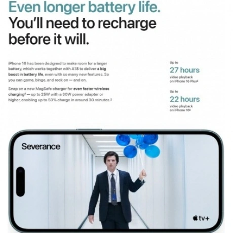 Apple iPhone 16 — смартфон последнего поколения от известного бренда. Модель может работать без подзарядки до 80 часов при воспроизведении музыки.
