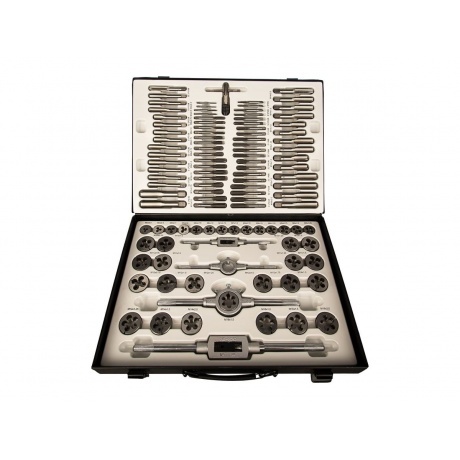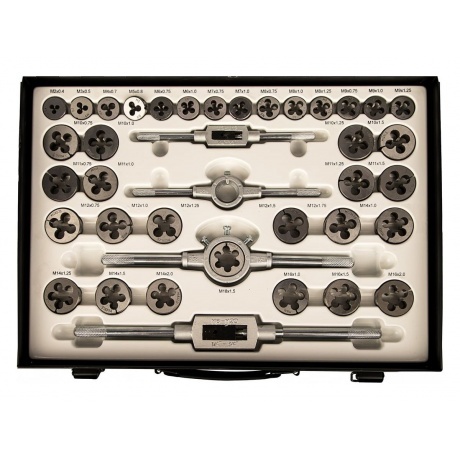 Набор метчиков и плашек, 110 предметов Gigant STD110 применяется для выполнения резьбонарезных работ. Метчики предназначены для создания внутренней резьбы, плашки – для наружной. Все компоненты набора изготовлены из стали марки 9ХС, устойчивой к коррозии.
