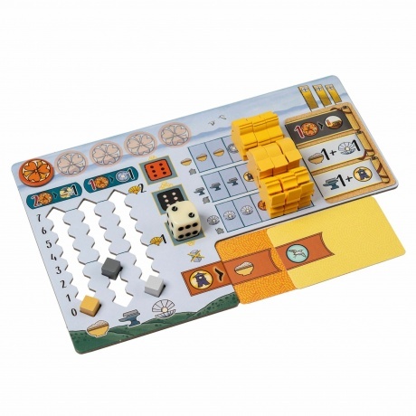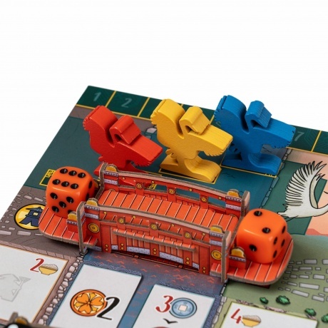 игровое поле, 4 планшета игроков, 77 карт, 85 деревянных фишек, 79 жетонов, 3 сборных фигурки мостов, 15 кубиков, правила игры