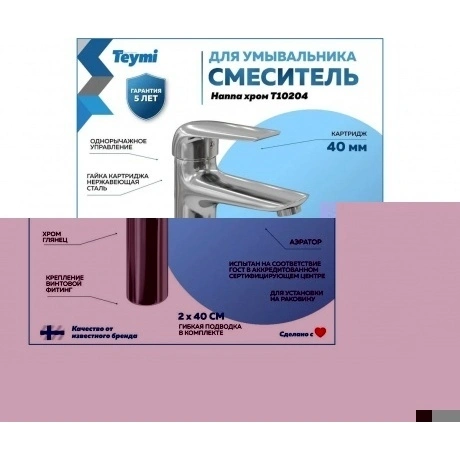 Смеситель для раковины Teymi Hanna, хром — это высококачественное и функциональное решение для вашей ванной комнаты. Изготовленный из прочных материалов, этот смеситель обладает долговечностью и надежностью. Глянцевая поверхность в стиле хрома придает ему элегантный и современный вид, который дополнит любой интерьер ванной комнаты. Смеситель Teymi Hanna, хром оснащен однорычажным механизмом, что делает его использование удобным и простым. Керамический картридж диаметром 40 мм обеспечивает плавное и точное регулирование потока воды. В комплекте со смесителем идут две гибкие подводки длиной 40 см каждая, что облегчает его установку. Аэратор в смесителе обеспечивает равномерное распределение воды, а также помогает экономить ее расход. Смеситель для раковины Teymi Hanna, хром — это отличный выбор для тех, кто ценит качество и стиль в своей ванной комнате. Известный финский бренд Teymi гарантирует высокое качество и надежность своих изделий. Продукция произведена в соответствии с требованиями ГОСТа Российской Федерации, прошла испытание в аккредитованном сертифицирующем центре и получила декларацию соответствия.