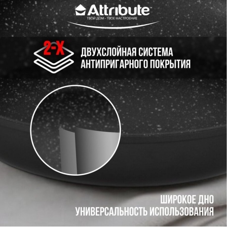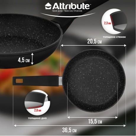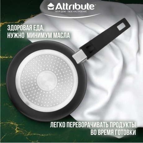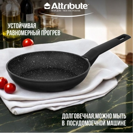 Сковорода ROCK от Attribute - это высококачественная посуда для приготовления пищи, которая сочетает в себе прочность и функциональность. Изготовленная из кованного алюминия, сковорода обеспечивает равномерное нагревание и быстрое приготовление блюд. Уникальная двухслойная система антипригарного покрытия гарантирует высокие антипригарные свойства и легкость очистки сковороды. Верхний слой покрытия обеспечивает отличные антипригарные свойства, а нижний слой прочно фиксирует покрытие на поверхности посуды. Благодаря антипригарному покрытию, вы можете готовить пищу с добавлением малого количества масла или без него, что делает процесс приготовления более здоровым и экологичным. Покрытие безопасно для контакта с пищей и не содержит PFOA, свинца и кадмия. Сковорода подходит для всех типов плит, включая индукционные, и может быть безопасно использована в посудомоечной машине для облегчения ухода за посудой.
