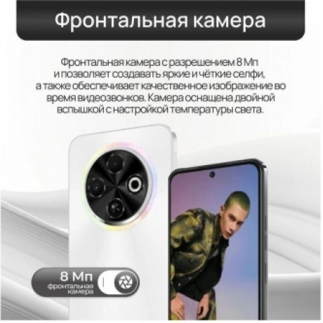Тыльная камера смартфона состоит из основного 50-мегапиксельного датчика, что позволяет делать качественные фотографии и видео. Фронтальная камера с разрешением 8 Мп обеспечивает качественные селфи и видеозвонки.