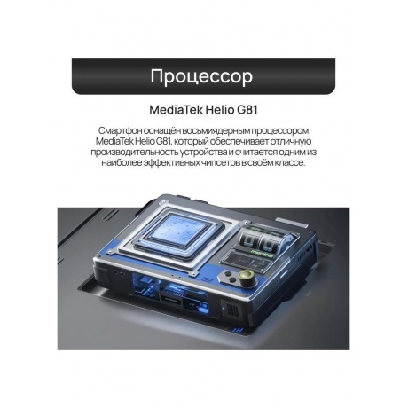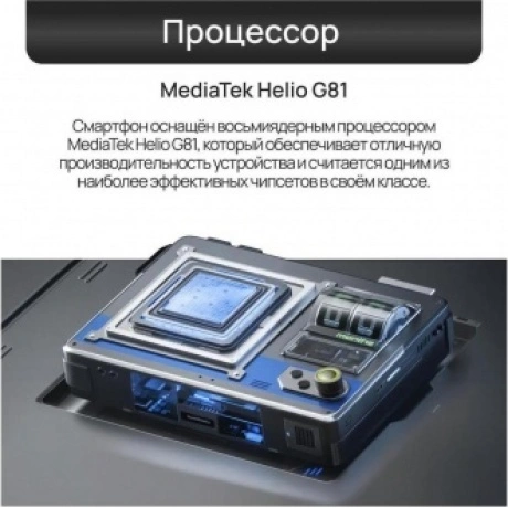 Аппаратная платформа новинки основана на процессоре MediaTek Helio G81. Это гарантирует высокую производительность и быстродействие при выполнении различных задач.
