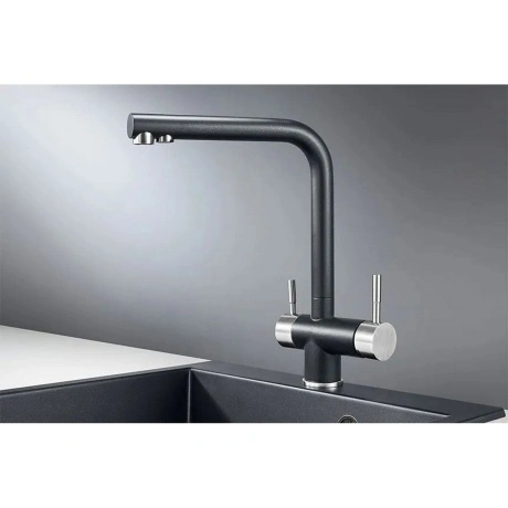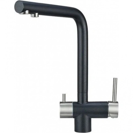 Смеситель для кухни GRANULA 2305 (Шварц) — современное решение с высоким поворотным изливом, обеспечивающим удобство при мытье посуды любого размера. Корпус из нержавеющей стали гарантирует долговечность, а двухрычажная система управления позволяет точно регулировать напор и температуру воды. Модель оснащена встроенным краном для питьевой воды и возможностью подключения фильтрации. В комплект входят гибкая подводка, крепежные элементы и аэратор для экономии расхода