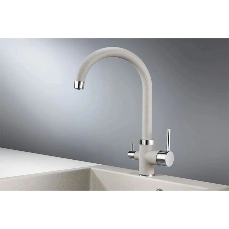 Смеситель для кухни GRANULA (2168, БАЗАЛЬТ) - современный однорычажный смеситель с поворотным изливом, изготовленный из латуни для долгого срока службы. Имеет подключение для фильтра питьевой воды и стильный дизайн в цвете базальт.
