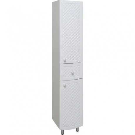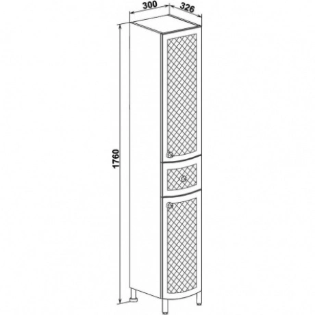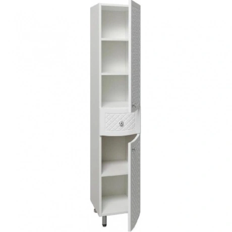 Шкаф-колонна напольный с двумя распашными дверками и выдвижным ящиком посередине. В верхнем отделении две внутренние полки, в нижнем одна. Петли со встроенным доводчиком, ящик на шариковых направляющих полного выдвижения
