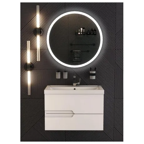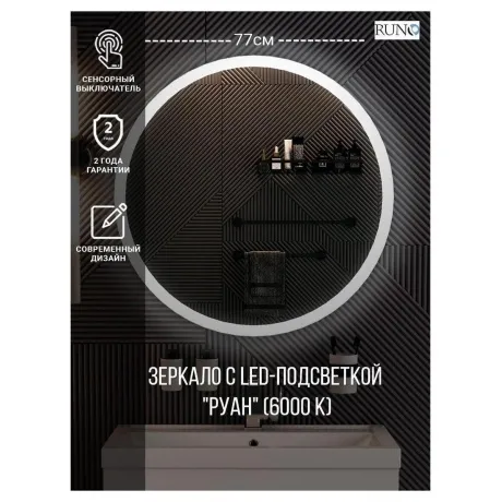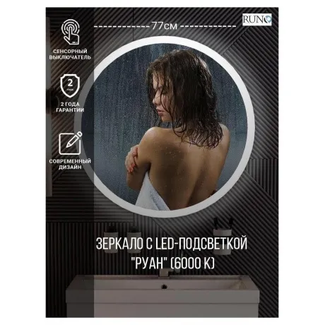 Зеркало с подсветкой Runo Руан Led D770 00-00001291 стильное, современное и практичное решение для оформления интерьера ванной комнаты, гостиной, спальни или прихожей. Мягкая светодиодная подсветка по периметру зеркала для ванной создаст домашние уют и тепло, а также привнесет изысканность в классический или ультрасовременный интерьер. Зеркало с LED подсветкой имеет защиту от брызг, благодаря чему зеркало можно использовать в помещениях с повышенной влажностью. Срок службы светодиодной подсветки не менее 50000 часов, что обеспечивается низким энергопотреблением. Яркость LED подсветки удобно регулировать с помощью сенсорной кнопки, наличие которой является дополнительной защитой электронной начинки зеркала от влаги и продлевает срок его службы.