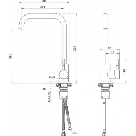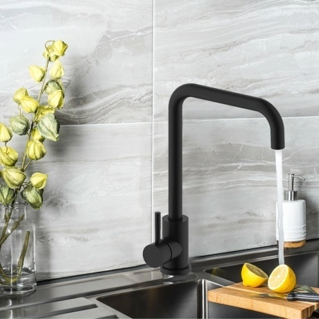 Смеситель OLIVES BALEAR 13435-2BLB - современный однозахватный смеситель для кухни, изготовленный из прочной нержавеющей стали. Имеет поворотный излив и керамический картридж, что обеспечивает удобство использования и долговечность. Дизайн выполнен в черном цвете с покрытием SHINE BLACK, что придает ему стильный и современный вид.