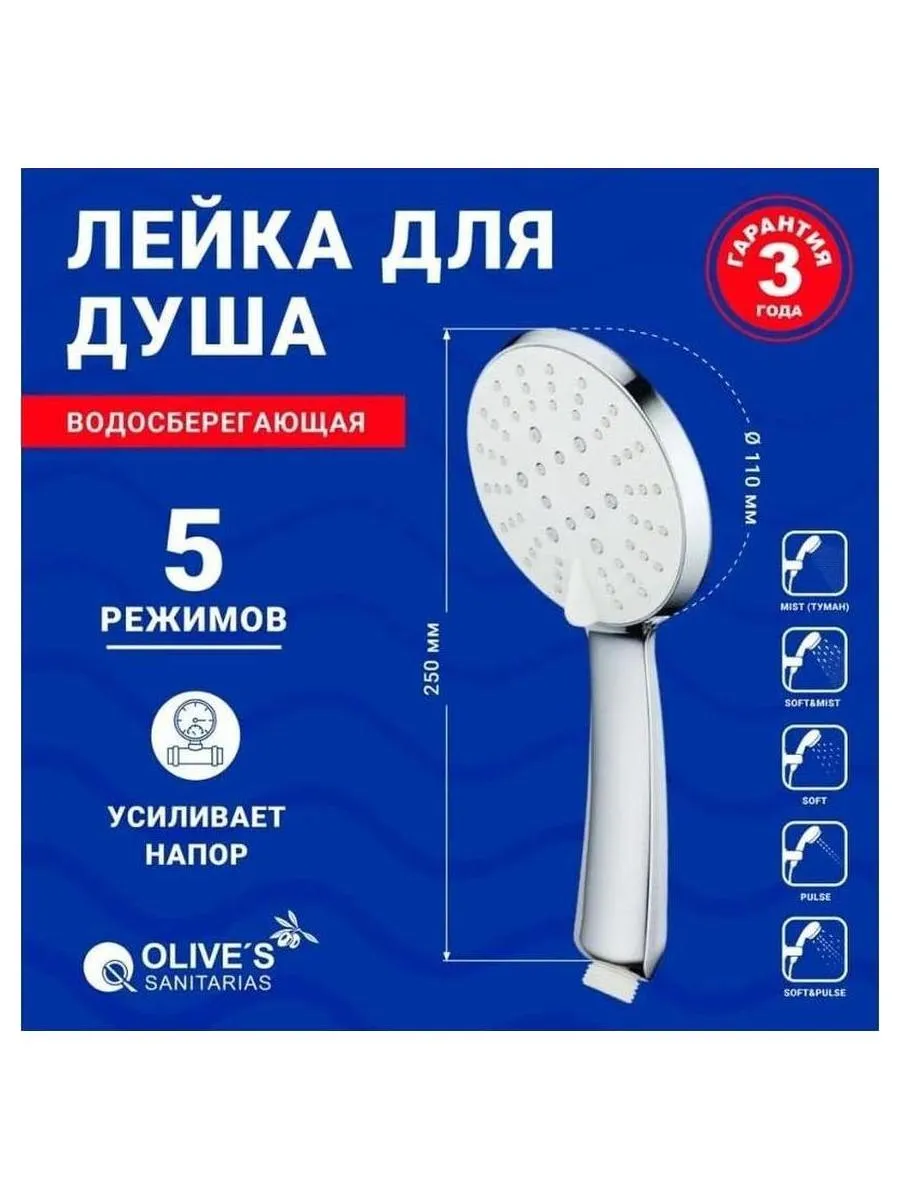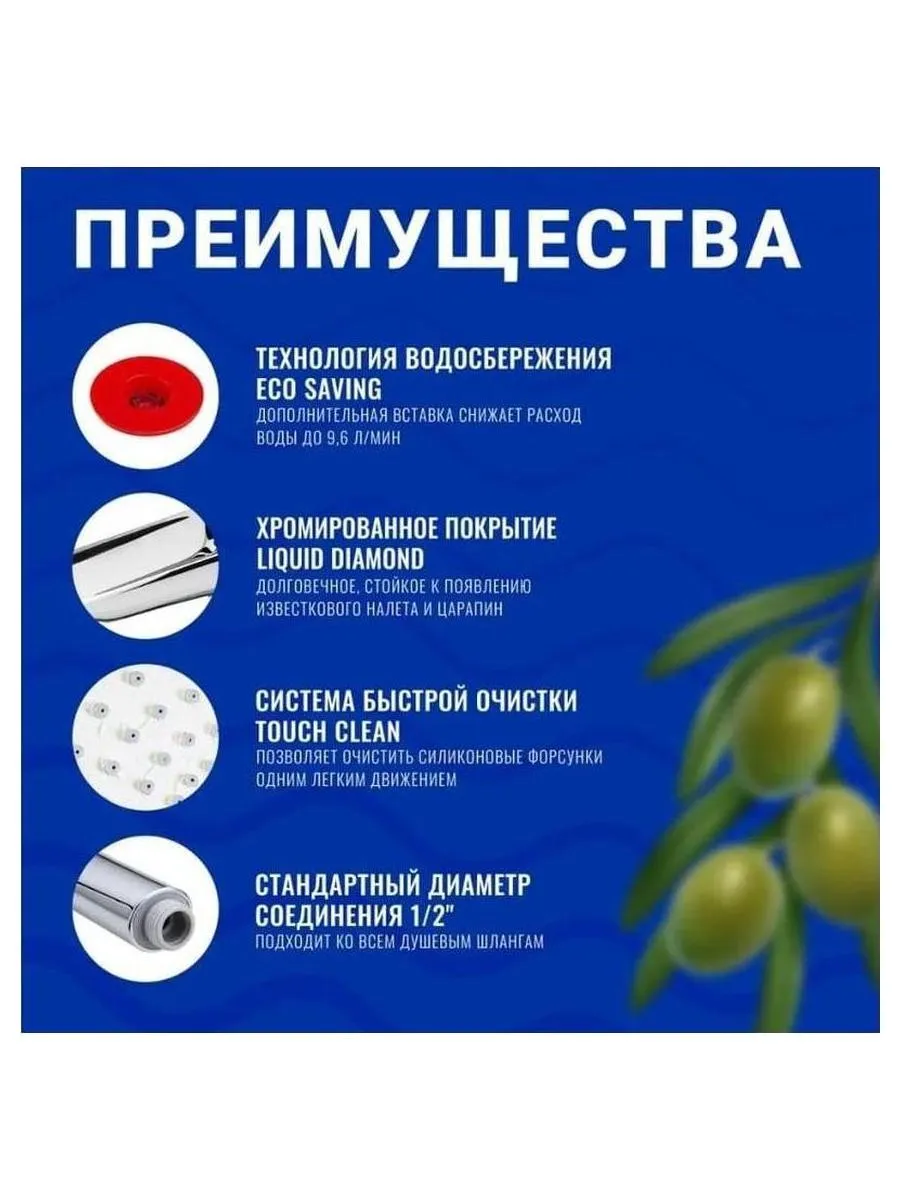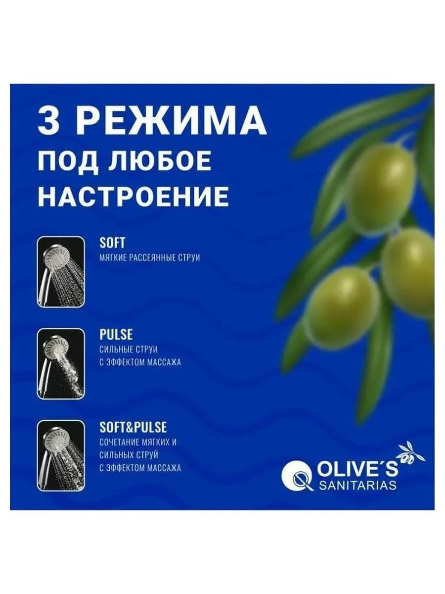 Лейка для душа 5 режимов (Soft, Pulse, Soft&Pulse, Mist, Soft&Mist). Легкое переключение режимов на корпусе позволяет менять режимы одной рукой. Дополнительная вставка ECO OLIVE’S сокращает расход воды до 9.6 л/мин. Лейка изготовлена из ABS-пластика — прочный износостойкий полимер. Хромированное покрытие Liquid Diamond обеспечивает зеркальный блеск, стойкость к появлению царапин и помутнений.