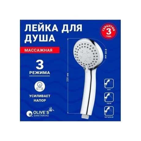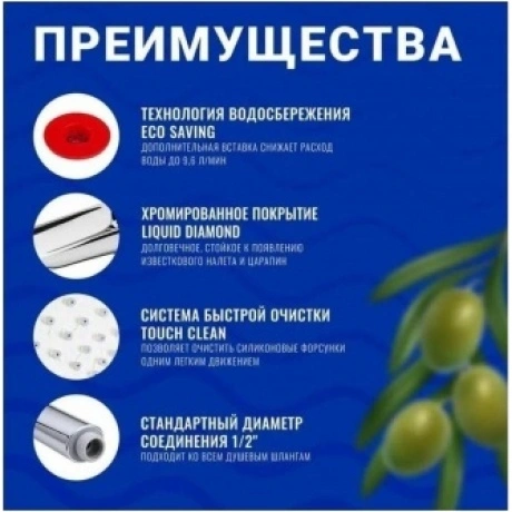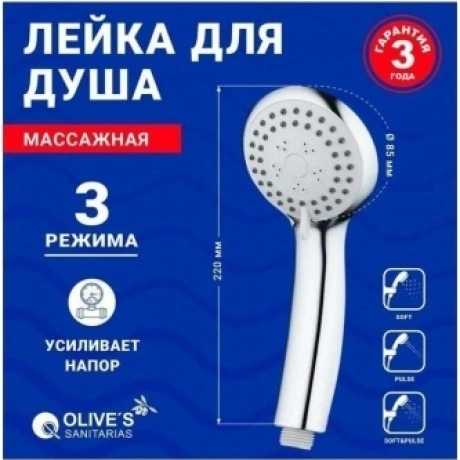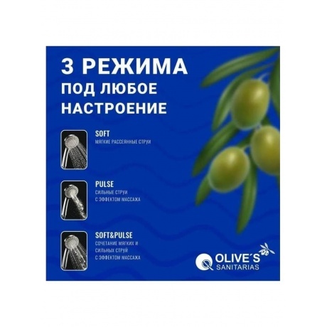 Лейка для душа Olives имеет 3 режима: - Soft - мягкие рассеянные струи - Pulse - сильные струи с эффектом массажа - Soft&Pulse - сочетание мягких и сильных струй с эффектом массажа Легкое переключение режимов на корпусе позволяет менять режимы одной рукой. Дополнительная вставка ECO (сокращает расход воды до 9.6 л/мин). Лейка изготовлена из ABS-пластика — прочный износостойкий полимер. Хромированное покрытие Liquid Diamond обеспечивает зеркальный блеск, стойкость к появлению царапин и помутнений.