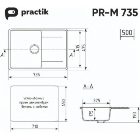 Односекционная реверсивная мойка Practik PR-735 с плоским крылом является оборачиваемой - крыло может располагаться как справа, так и слева. Материал мойки представляет из себя искусственный камень, который является композитом на основе натурального мрамора и связующих смол. Искусственный камень существенно снижает уровень шума при падении струи воды. Специальное покрытие гелькоут защищает поверхность мойки от загрязнений и бытовых царапин, делая уход за мойкой легким и простым. Данная мойка имеет устанавливается в шкаф от 50 см и дает возможность осуществить монтаж мойки в стандартную столешницу шириной 60 см, а также открывает широкий спектр возможностей при проектировании кухни.