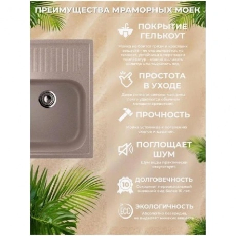 Надежная и функциональная кухонная мойка. Выполнена из износостойких материалов, имеет современный внешний вид и проста в уходе и установке. Уникальный верхний защитный слой - Гелькоут - обеспечивает безопасность и удобство использования. Размер чаши - 400х370 мм. Установочный проем - 615х465 мм. Минимальная база для изделия - 450 мм.